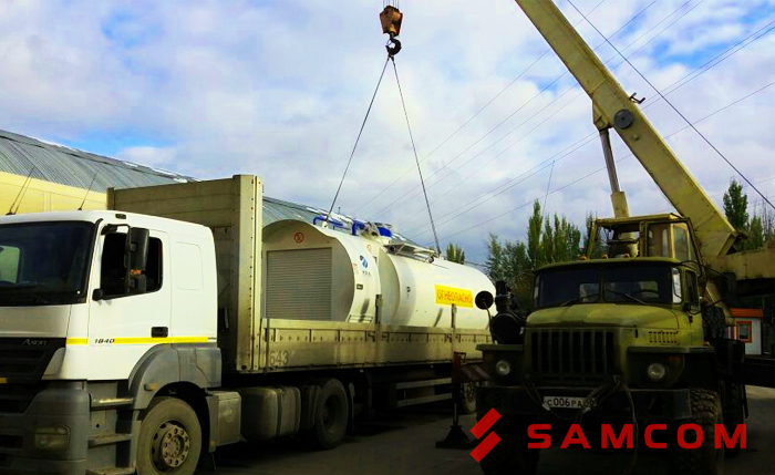 Резервуары для мобильных АЗС – незаменимая вещь в условиях Крайнего Севера или удаленных регионов. Они универсальны и могут использоваться как для заправки техники, так и для обеспечения генераторов энергии топливом. Вес данного резервуара составил 4700 килограмм. И, само собой, нужно понимать, что данный резервуар относится к категории опасных грузов и требуют от водителей фур и оператора подъемника соответствующей квалификации.