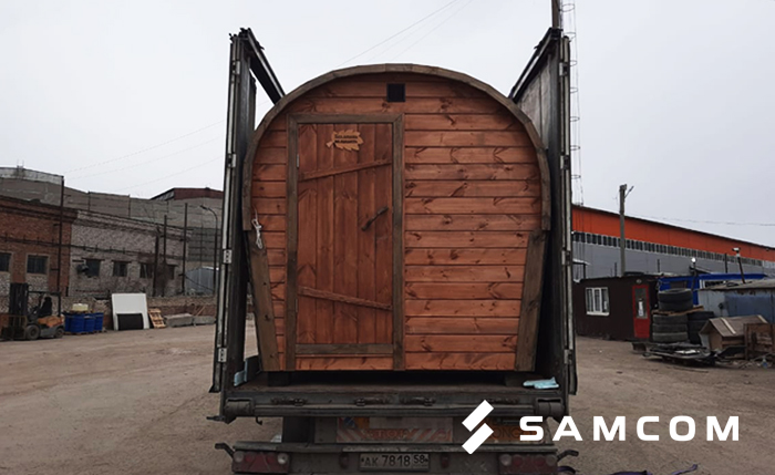 В апреле к нам поступила необычная заявка на транспортировку деревянной бани «Бочка». Габариты конструкции составили 3 х 2,4 х 2,5 м, а маршрут следования из Заречного в Уральск.